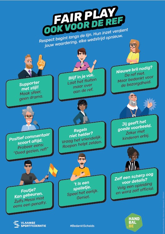 Officials hebben een sleutelrol in de sport: ze zorgen ervoor dat wedstrijden eerlijk en met respect verlopen. Het is niet altijd gemakkelijk om deze taak op te nemen. Met de 9 regels van het charter vragen we meer respect langs de lijn. Hun inzet verdient waardering, elke wedstrijd opnieuw.