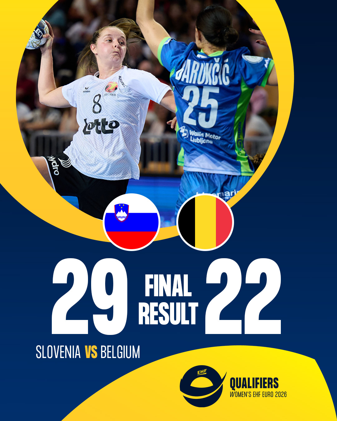 De Black Arrows hebben hun eerste officiële kwalificatiewedstrijd in aanloop van een groot tornooi verloren van Slovenië. Halfweg de partij was het 17 – 8 in het voordeel van de thuisploeg. De wedstrijd eindigde uiteindelijk op 29 – 22. Een logische zege van de Slovenen, maar ook een verdienstelijke prestatie van de Belgische dames bij hun debuut op het hoogste niveau. Tot de laatste minuut bleven Black Arrows alles geven onder impuls van een indrukwekkende Nele Antonissen goed voor maar liefst 13 doelpunten.